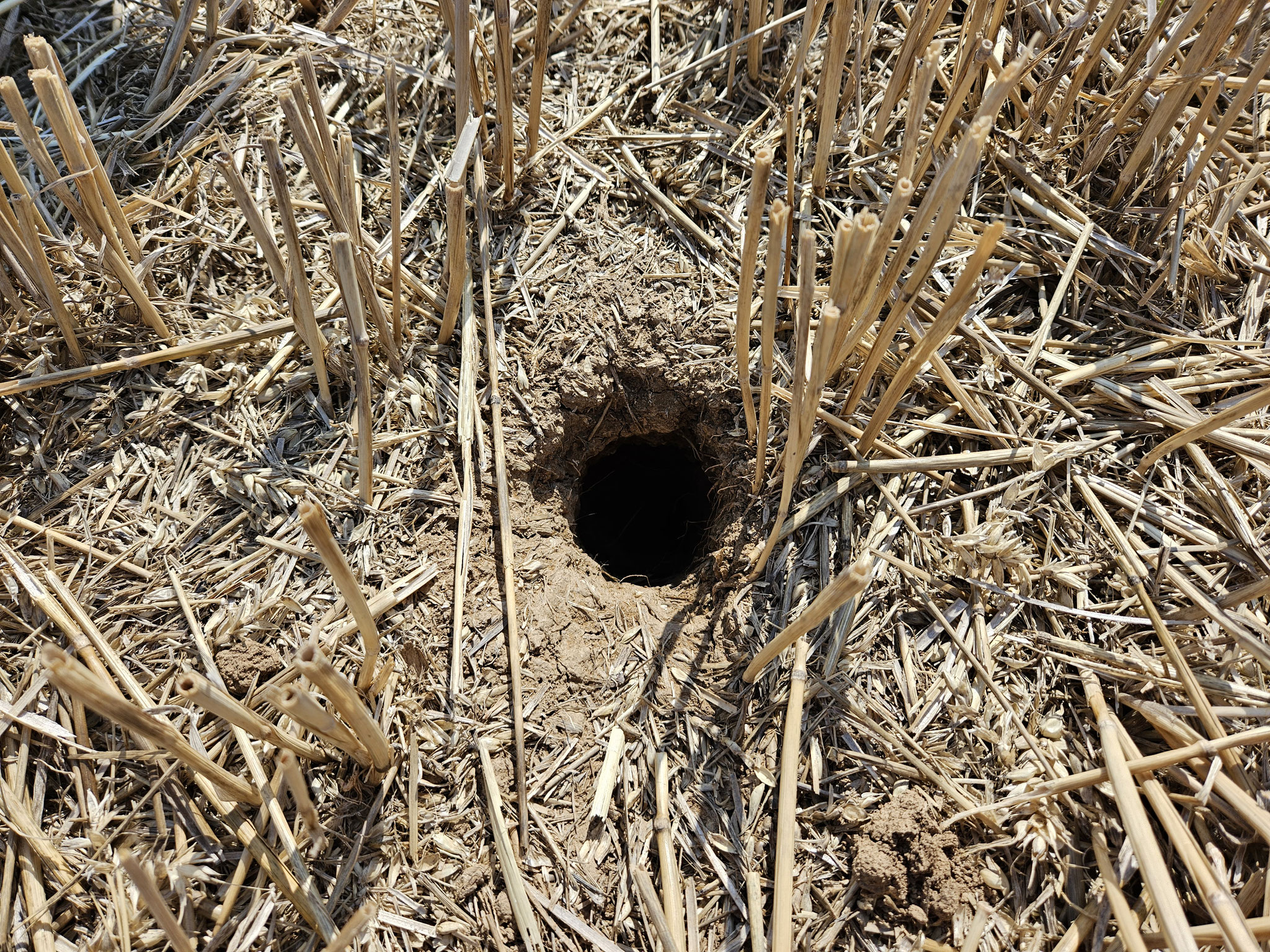 Anschließend betrachteten wir einen bereits kartierten Feldhamsterbau, der für gewöhnlich aus einem Netzwerk von Gängen besteht, die zu verschiedenen Kammern führen, darunter Nest-, Vorrats- und Toilettenkammern. Im Sommer gibt es mehrere Eingänge mit faustgroßem Durchmesser, oft mit schräg verlaufenden Röhren und Fallröhren, um sich bei Gefahr schnell in Sicherheit zu bringen. Im Winter ist meist nur ein Eingang vorhanden, der vor Beginn des Winterschlafs mit Erde verschlossen wird.