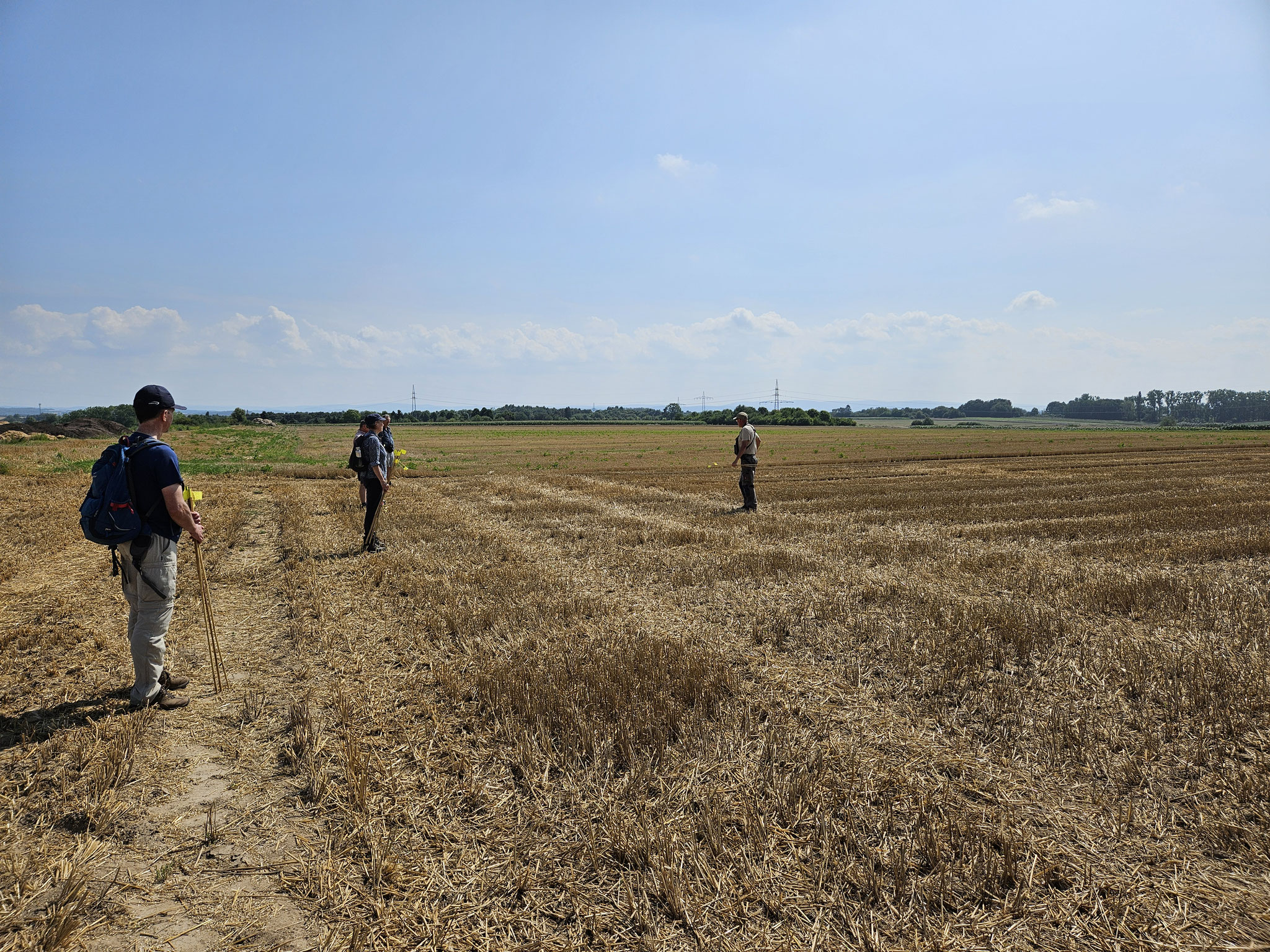 Auch wir unterstützten bei der Nacherntekartierung. Nachdem wir Markierungsstäbe bekommen und eine Einführung, wie ein Feld abzulaufen und nach Feldhamsterbauen zu suchen ist, ging es los. 12 Baue haben wir in Summe gefunden, und Manfred Sattler hat nicht zu viel versprochen: "Das Suchen der Baue ist wie das Goldschürfen: Man freut sich überschwänglich einen 'Goldnugget' zu finden." Mit strahlenden und zufriedenen Gesichtern machten wir uns wieder auf den Weg nach Frankfurt.