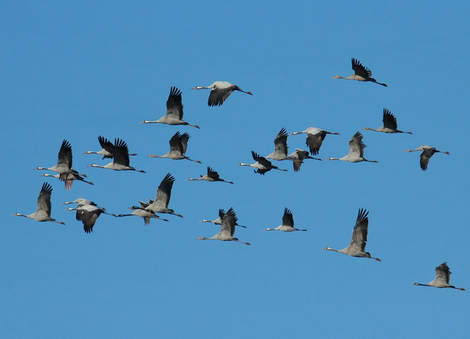 Für Naturbeobachter*innen sind die ziehenden Kraniche an ihrer keilförmigen Formation und den trompetenartigen Rufen zu erkennen. Die kräftigen und erfahrenen Tiere fliegen an der Spitze, dann folgen Familien mit durchschnittlich zwei Jungtieren. Bei günstigen Flugbedingungen können die bis 1,30 Meter großen Tiere ohne Halt bis nach Südeuropa fliegen. Manche legen bei Wetterumschwüngen aber auch eine Rast in Hessen ein. Sie landen dann z.B. im Amöneburger Becken oder in den Flusstälern von Fulda, Werra, Schwalm, Ohm und Lahn. Auch Feuchtgebiete in der Wetterau und die Rheinauen in Südhessen sind gern aufgesuchte Orte zum Ausruhen. Die Rücksichtnahme an den Rastplätzen ist notwendig, weil viele Kraniche bereits eine weite Flugstrecke hinter sich haben, wenn sie in Hessen eine Pause einlegen. Sie brauchen Ruhe und die Gelegenheit, etwas zu fressen und wieder Kräfte zu sammeln.